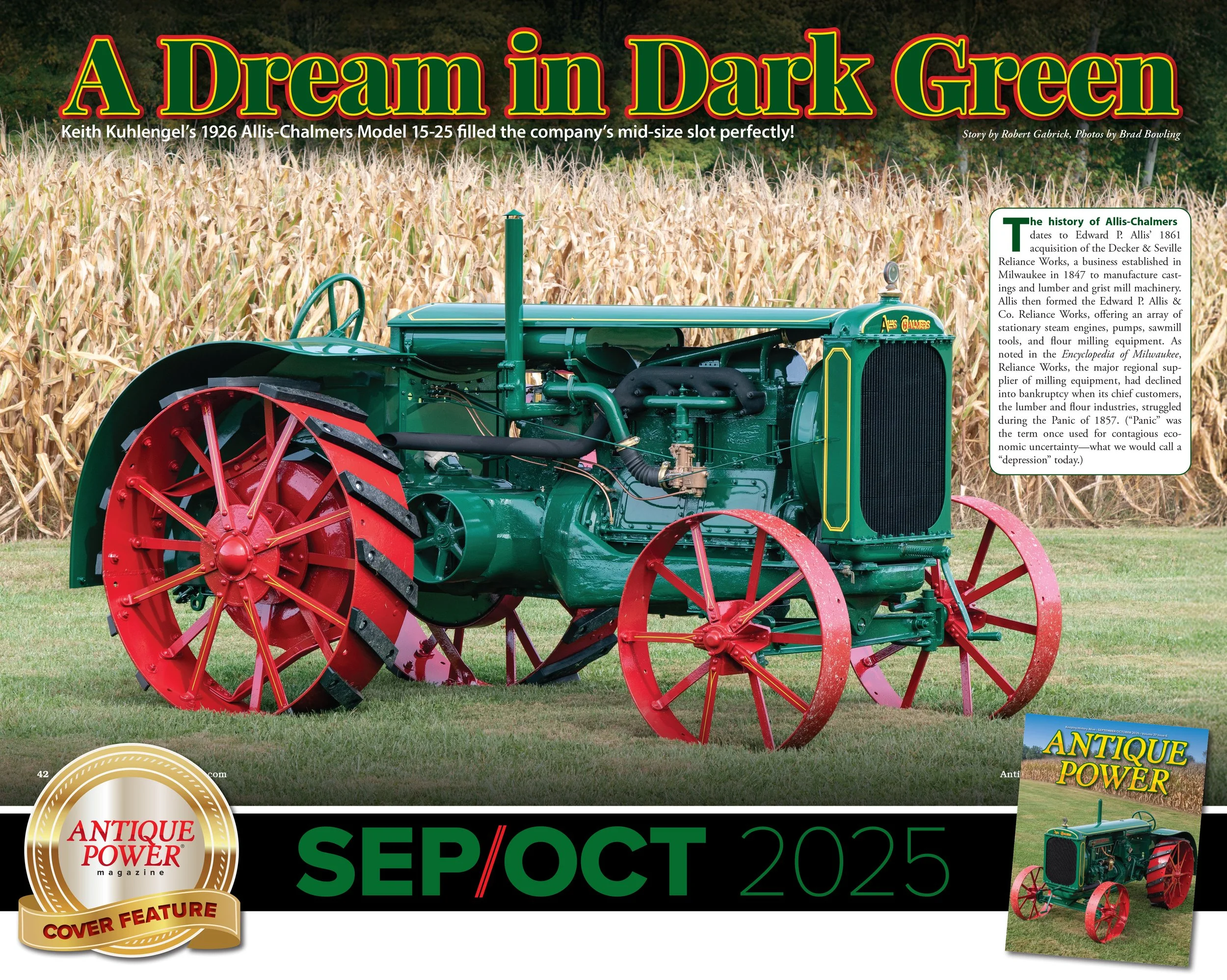 The September/October 2025 issue of Antique Power magazine is available in our gift shop and will be available in subscriber mailboxes and on newsstands soon. Check out this beauty! Keith Kuhlengel’s 1926 Allis-Chalmers Model 15-25 filled the company’s mid-size slot perfectly!